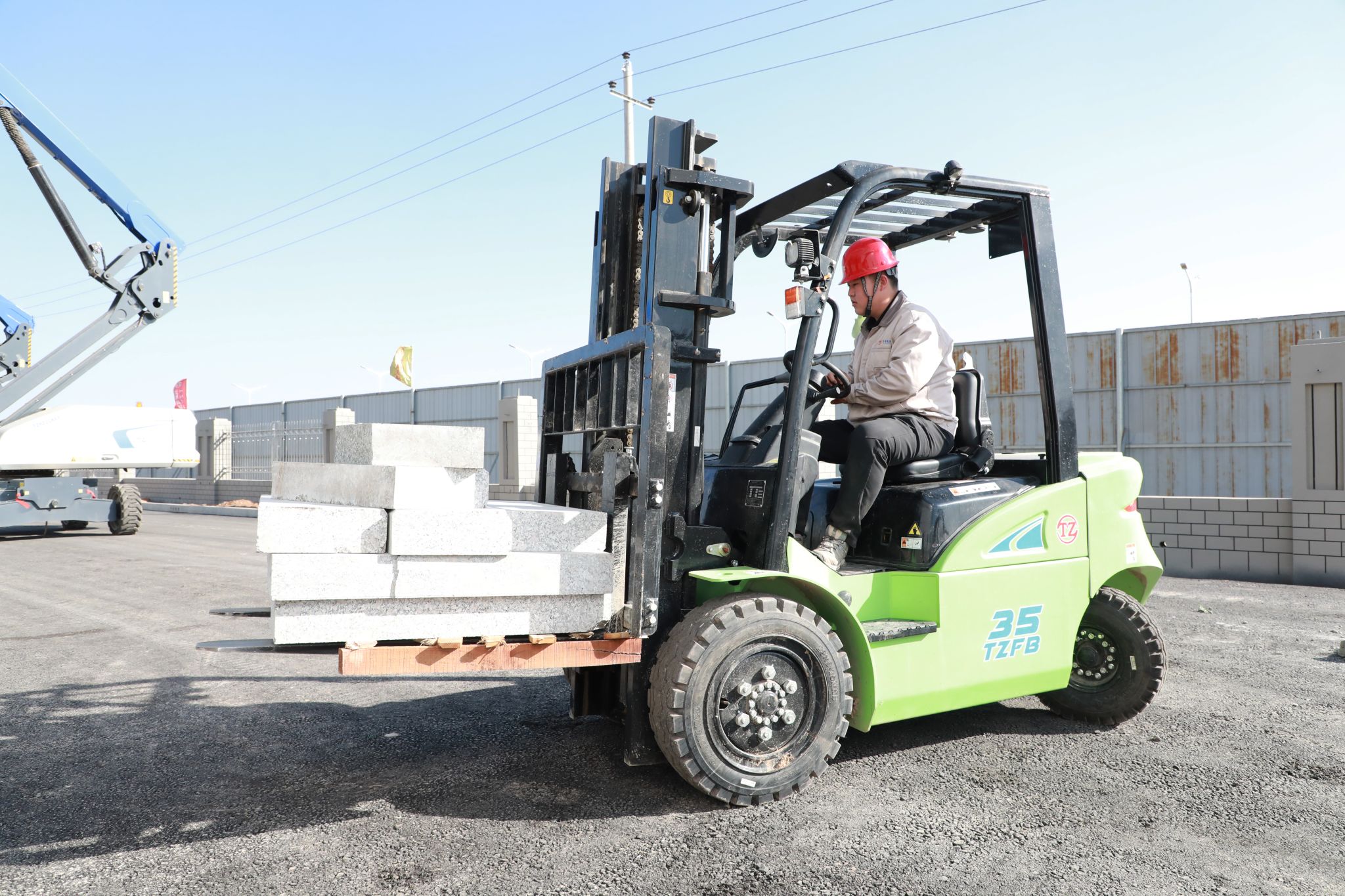 在這片機(jī)械轟鳴、車輛往來穿梭的忙碌工地上,一臺(tái)臺(tái)通體鮮綠的鋰電平衡重叉車格外醒目——這是公司自主研發(fā)的3.5噸新能源叉車,此刻正執(zhí)行路緣石轉(zhuǎn)運(yùn)任務(wù)。操作員精準(zhǔn)操控著叉臂,貨叉穩(wěn)穩(wěn)嵌入路緣石底部托盤,隨著液壓桿伸縮,近一米長(zhǎng)的青灰色石料被平穩(wěn)托起。后輪轉(zhuǎn)向系統(tǒng)讓它們?cè)讵M窄空間游刃有余,在擺尾時(shí)劃出利落弧線,整車如游魚般輕盈轉(zhuǎn)向。工人笑著稱贊道:“這車好啊,是我開過最靈活的!”