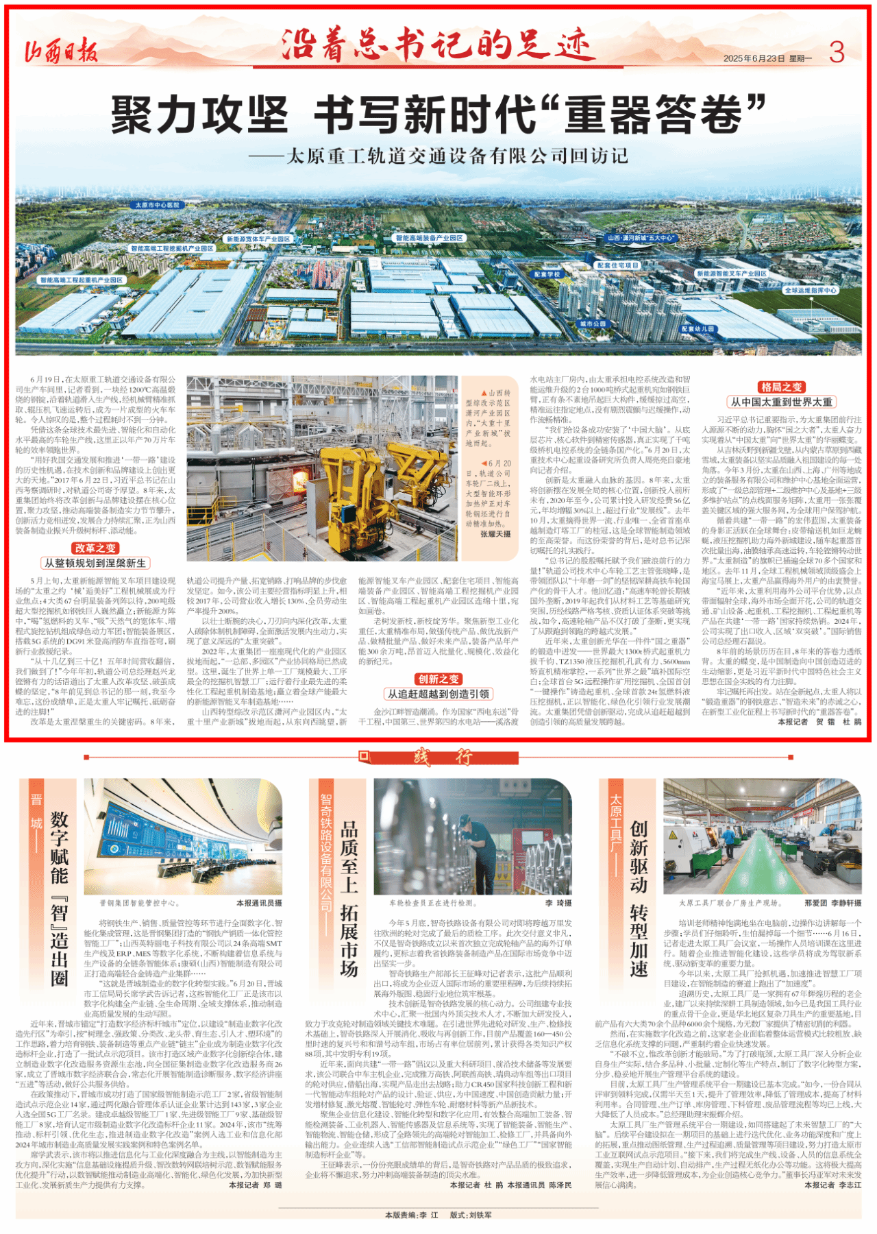 在習(xí)近平總書記考察調(diào)研太重八周年之際,山西新聞聯(lián)播、山西日?qǐng)?bào)【沿著總書記的足跡】專欄聚焦太重,感知公司“智”造高地的澎湃動(dòng)能,展現(xiàn)太重的改革之變、創(chuàng)新之變、格局之變,見證太重人加速競跑的具體實(shí)踐!