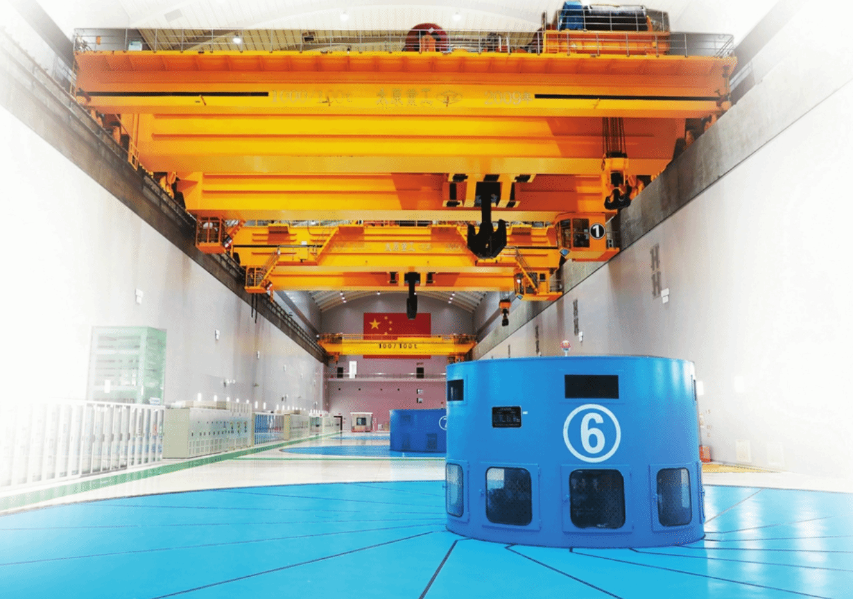 踏入這座智能化水平位居世界前列的水電站主廠房,映入眼簾的是震撼的工業(yè)圖景,耳中持續(xù)回響側(cè)排電箱發(fā)出的規(guī)律嗡鳴。廠房上空數(shù)十米處,太重研制的兩臺1000t橋式起重機正有條不紊地吊起巨大構(gòu)件緩緩掠過高空,精準(zhǔn)地運往指定地點。沒有想象中的劇烈震顫與遲緩操作,所有動作都流暢而精準(zhǔn),令人贊嘆。